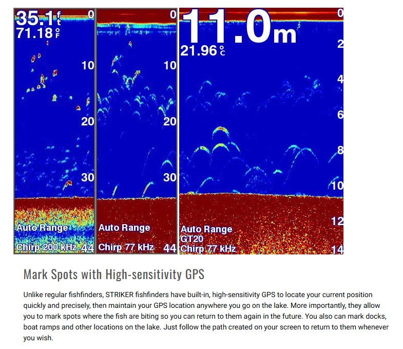 STRIKER 4 fishfinder includes a Garmin CHIRP (77/200 kHz) transducer, which provides a visibly higher level of clarity and detail for fish and structure than traditional 77/200 kHz transducers.