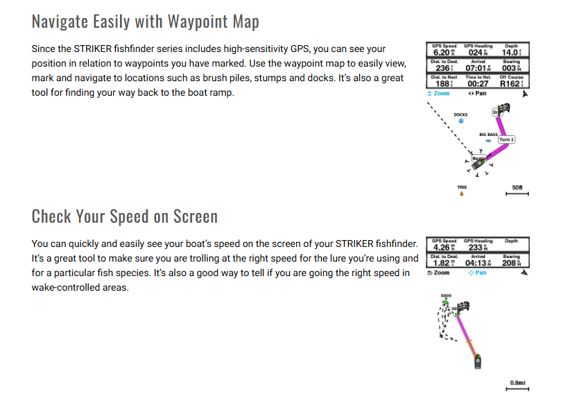 Finding fish is easier than ever with STRIKER 4 fishfinder. Mark and return to your hot spots, boat ramps and docks, and share your favorite waypoints and routes with other STRIKER and echoMAP™ combos. Smooth Scaling™ graphics provide uninterrupted imagery when switching between depth-range scales. Sonar history rewind allows you to scroll back through sonar images to mark waypoints you originally may have missed. Plus, it has a built-in flasher and displays speed data. Includes tilt/swivel mount, CHIRP (77/200 kHz) transducer with transom and trolling motor mounting hardware and cable. For high-performance CHIRP, purchase a GT8 or GT15 transducer (each sold separately).