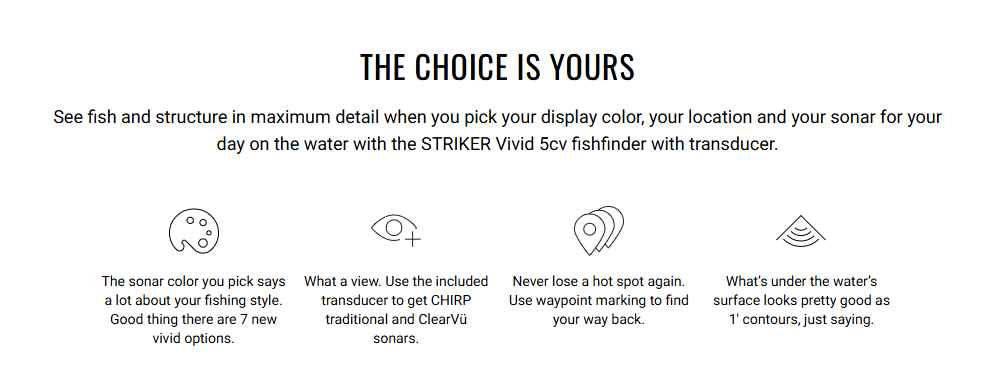 Overview Reviews Product Description WARNING: Cancer and Reproductive Harm -www.P65Warnings.ca.gov Product Videos Custom Field Product Reviews Write a Review Write a Review × Garmin Garmin Striker Vivid 5CV GT20-TM Rating * Select Rating 1 star (worst) 2 stars 3 stars (average) 4 stars 5 stars (best) Name Email * Review Subject * Comments *