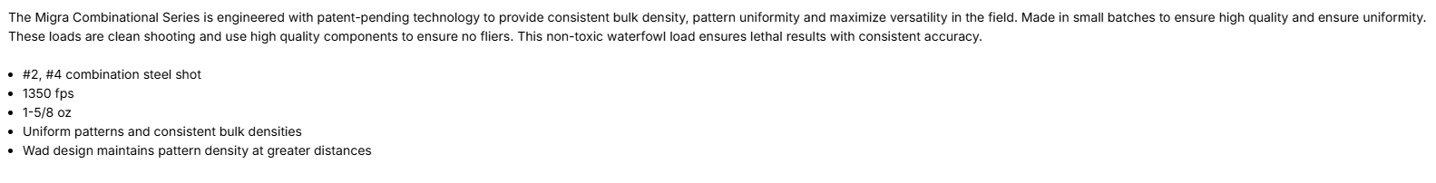 Quick view Details Migra | sku: MGM-12SS2-4 Migra Steel Waterfowl Staxd Load MSRP: Now: $29.99 Sold-Out: Enter email to be notified when new stock arrives Quick view Details Migra | sku: MGM-12SB4-6 Migra Timber Plus Ammunition 12GA Steel/Bismuth 3" MSRP: Now: $44.49 Add to Cart
