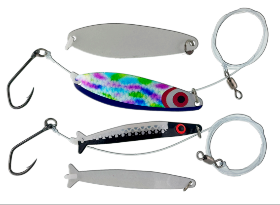 Instead of tying the line to the ring on the lead end of the spoon you tie directly to the ring and hook assembly. Then the line is passed through the clevis attached to the tail end of the spoon and on through the ring on the lead end of the spoon. Rig the spoon with the same leader size and length that would be used with a traditional Silver Horde spoon. The lure will fish with the same fish enticing action.